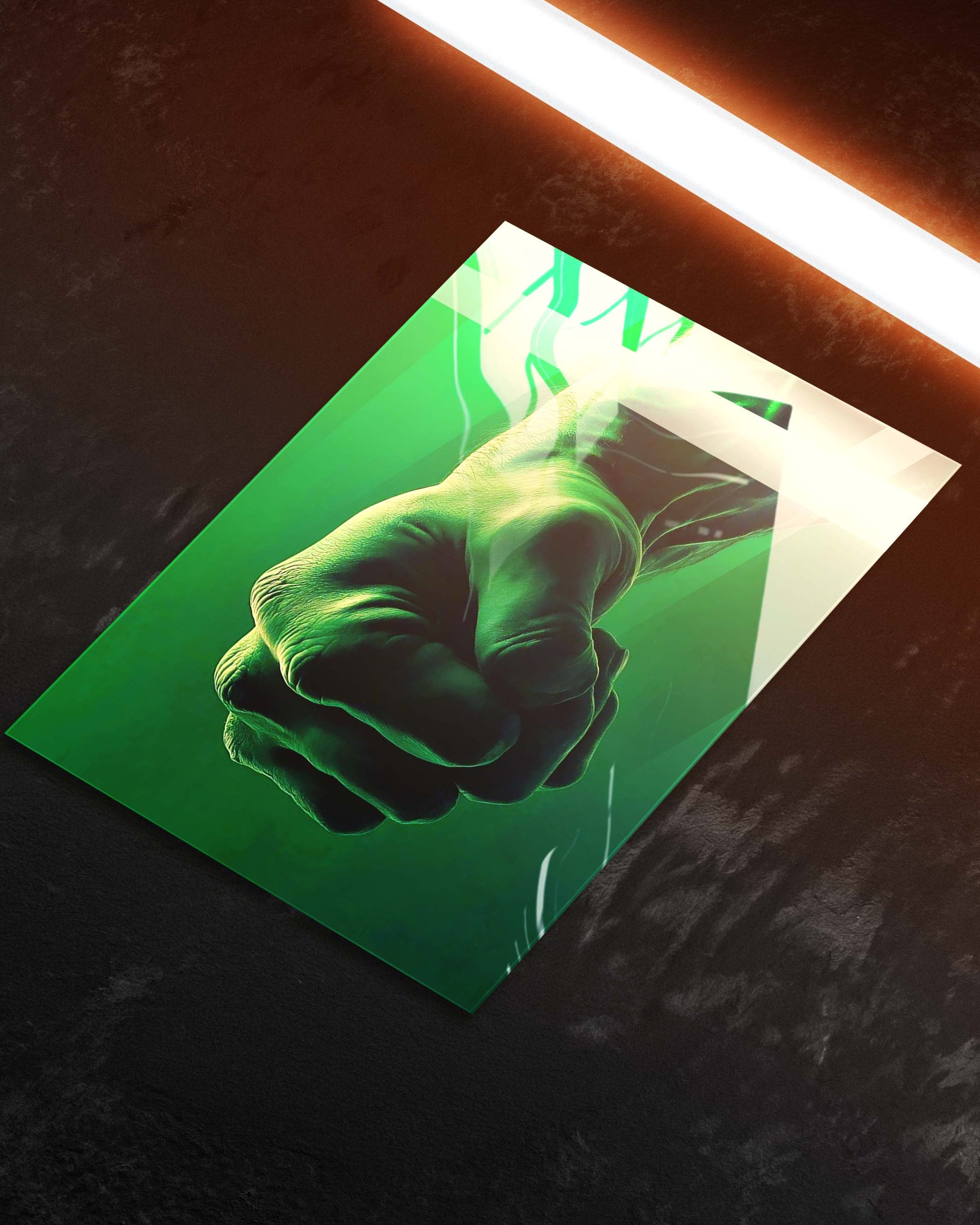 Unleash the raw, unstoppable power of the Jade Giant with this high-impact metal poster. Featuring a hyper-detailed, gamma-green clenched fist, this piece captures the ultimate symbol of strength and resilience.